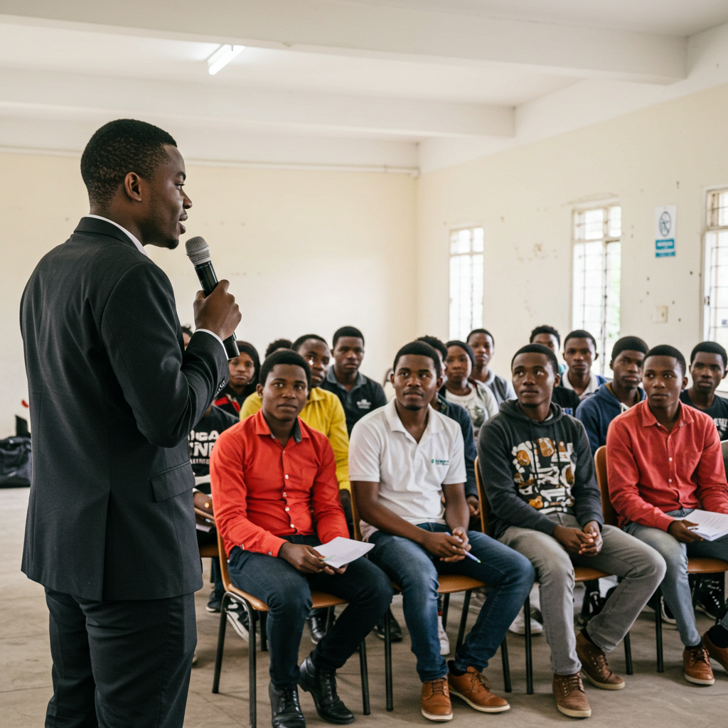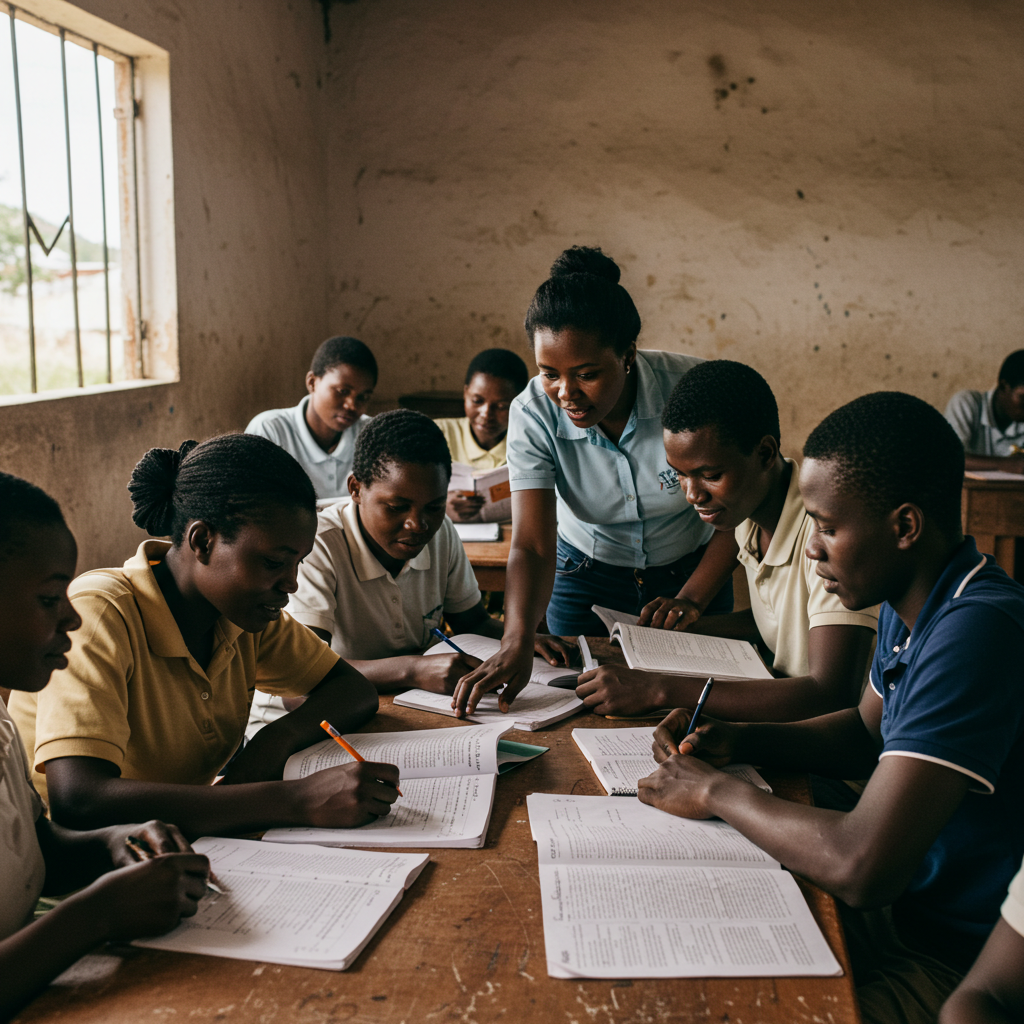 Young Zambian entrepreneurs receiving business coaching and mentoring, discussing ideas in a vibrant group setting.